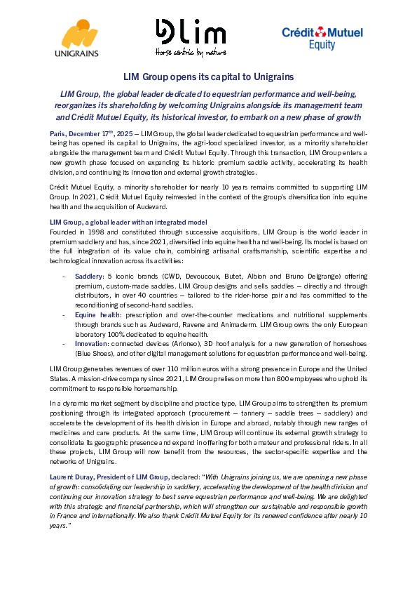 Unigrains Développement is a private equity asset manager, registered with the AMF under the number GP-16000003, since February 3rd, 2016. A wholly owned subsidiary of Unigrains, it manages French and European funds dedicated to agri-food companies. The company established a branch under Italian law in July 2017 in Milan.